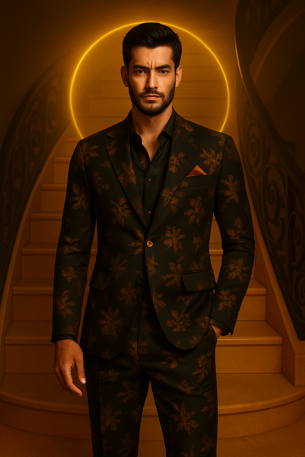 Le modèle Belleville incarne une vision majestueuse du costume masculin. Sa teinte noire profonde rehaussée d’un motif floral jacquard crée une aura mystérieuse et captivante, pensée pour ceux qui souhaitent dominer l’instant avec élégance. Chaque couture, chaque bouton doré, chaque ligne évoque l’exigence du détail, signature incontournable d’ADN.