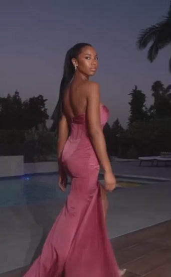 Son encolure droite, sublimée par de subtils plissés sur la poitrine, révèle une allure chic et maîtrisée, tandis que les drapés délicats au niveau des hanches apportent structure et fluidité. Une fente élégante au bas de la jambe vient moderniser la pièce et offrir une touche de sensualité discrète.